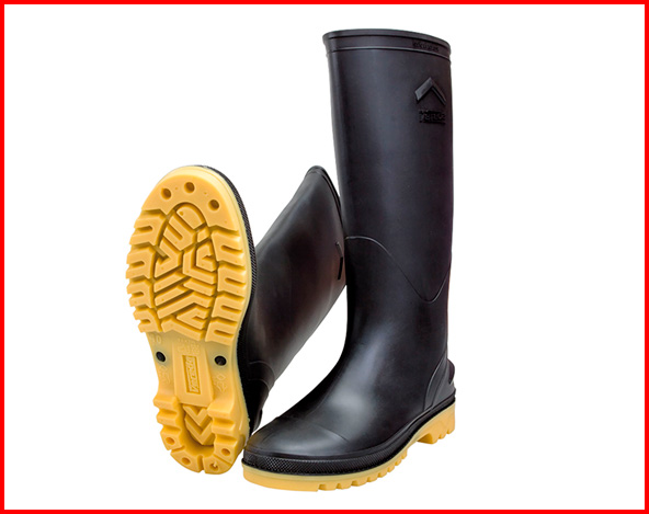 Policloruro de vinilo plastificado, PVC CON NITRILO RESISTENTE A HIDROCARBUROS (RH)/ en colores negro y amarillo /diseño y materiales ergonómicos de inyección directa de PVC / alta resistencia y gran flexibilidad /100% impermeable / Caña y suela con nitrilo / protección al tobillo / Suela con diseño en relieve con efecto antideslizante, color negro.
